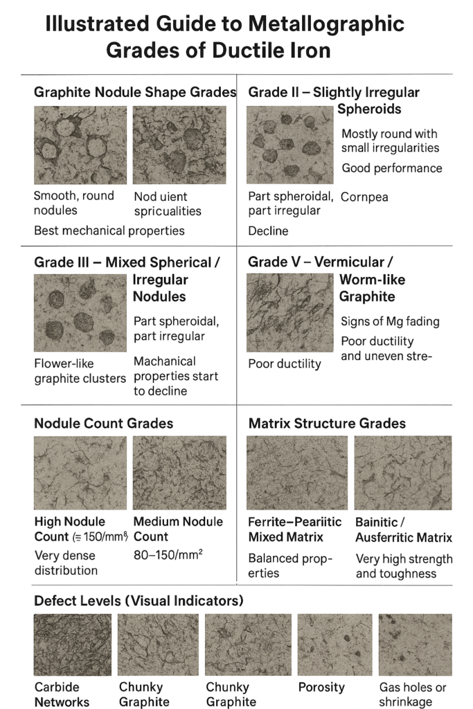 The metallographic grade of ductile iron is a critical factor in determining its reliability and suitability for various applications. By evaluating graphite shape, nodule count, matrix structure, and defect levels, manufacturers can ensure consistent quality control and optimize performance.
